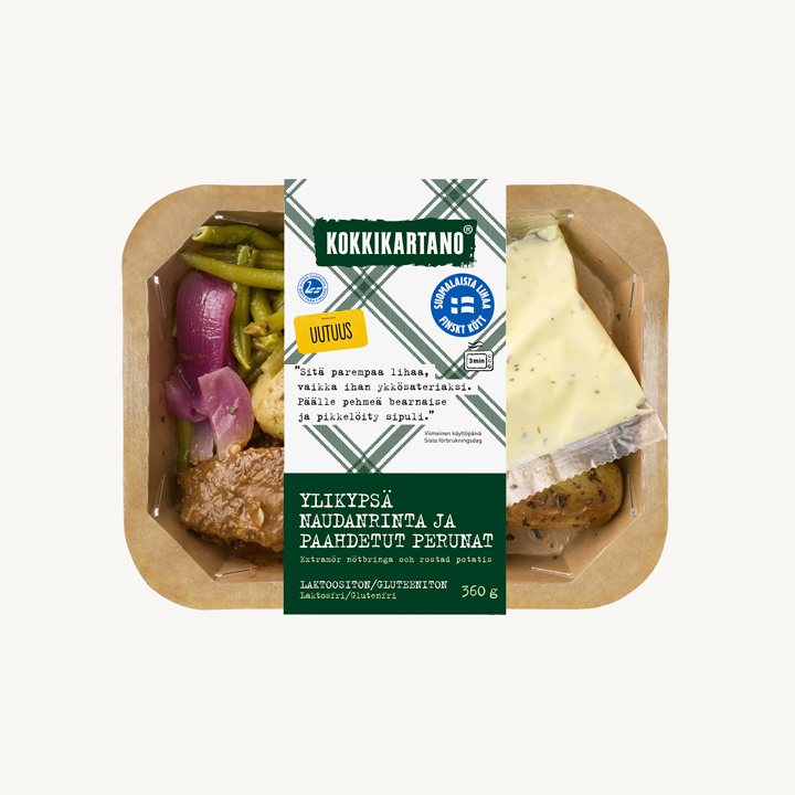 Paahdettu peruna 166 g: Peruna 96 % (Suomi), rapsiöljy, jodioitu suola, rosmariini, mustapippuri. Naudanrintaa kastikkeessa 95 g: Snellmanin naudanliha 89 % (Suomi), rapsiöljy, sokeri, maissitärkkelys, poltettu sokeri, jodioitu suola, perunatärkkelys, valkosipuli, mustapippuri, timjami, rosmariini, vesi. Bearnaisekastike 50 g: Rapsiöljy, vesi, kananmunan keltuainen, sokeri, valkoviinietikka, väkiviinaetikka, jodioitu suola, sinappi (vesi, sinapinsiemenet, etikka, rypsiöljy, suola, mausteuute (kurkuma)), rakuuna, säilöntäaineet (E211, E202), kurkuma, valkopippuri. Basilikapavut 29 g: Vihreä papu (EU), rapsiöljy, valkosipuli, jodioitu suola, basilika, mustapippuri. Pikkelöity punasipuli 20 g: Punasipuli, vesi, sokeri, väkiviinaetikka.